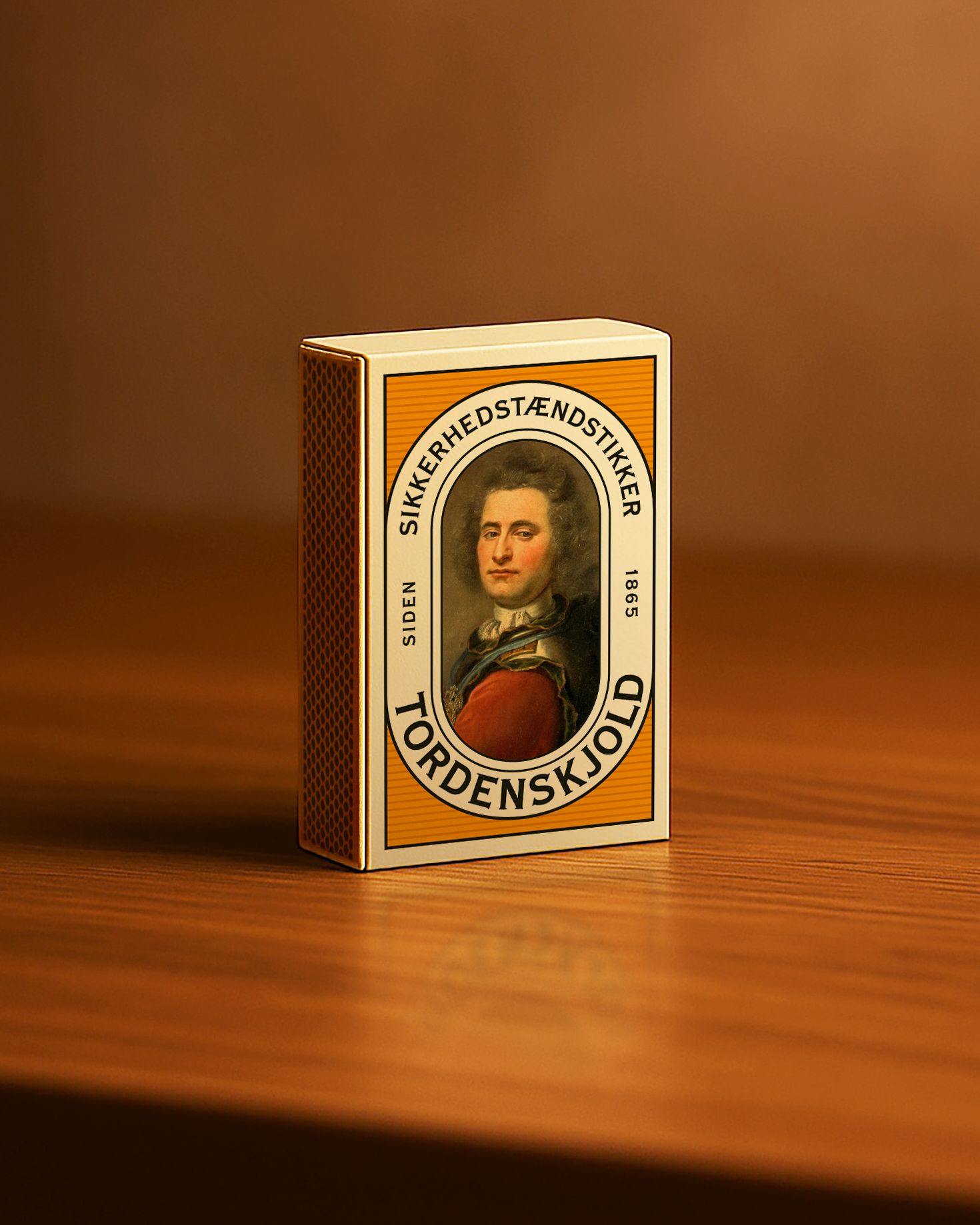 Med inspiration fra de tidligste tændstikæsker fra slutningen af 1800-tallet har vi genintroduceret fine horisontale linjer som en hyldest til dansk designhistorie. Portrættet er blevet støvet af og har fået en varmere tone, og “Siden 1865” har nu fået en tydeligere placering på forsiden. Samtidig har vi erstattet den tidligere farvegradient med en ren orange farve, som giver ro i udtrykket og lader de ikoniske elementer træde tydeligere frem.